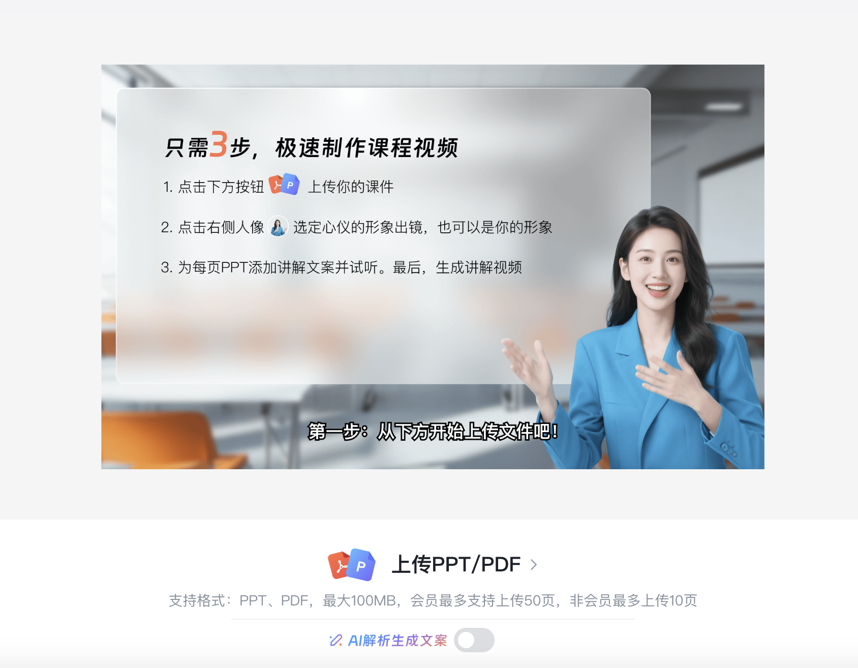 直接拖拽或点击上传您的PPT或PDF文件,系统秒级解析,为您准备好所有素材。